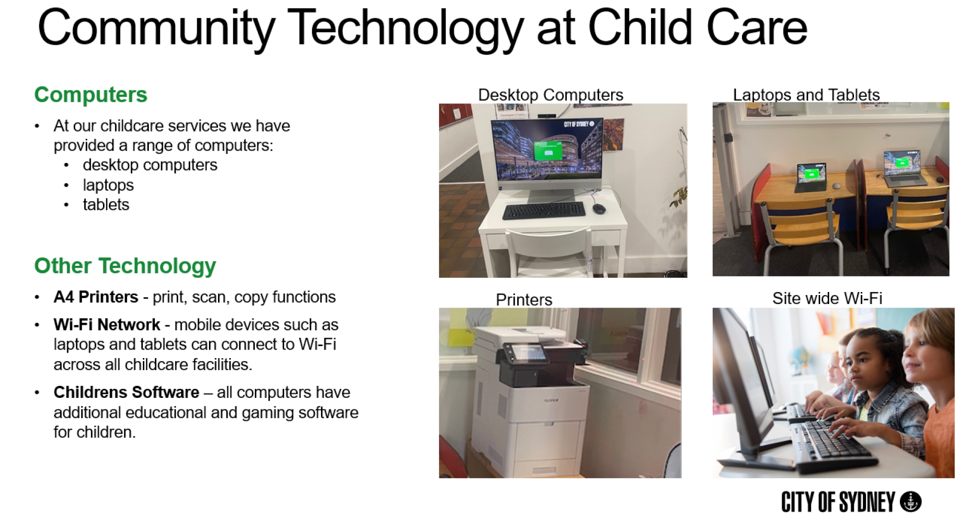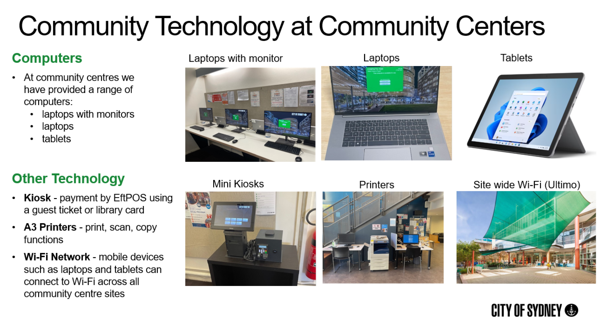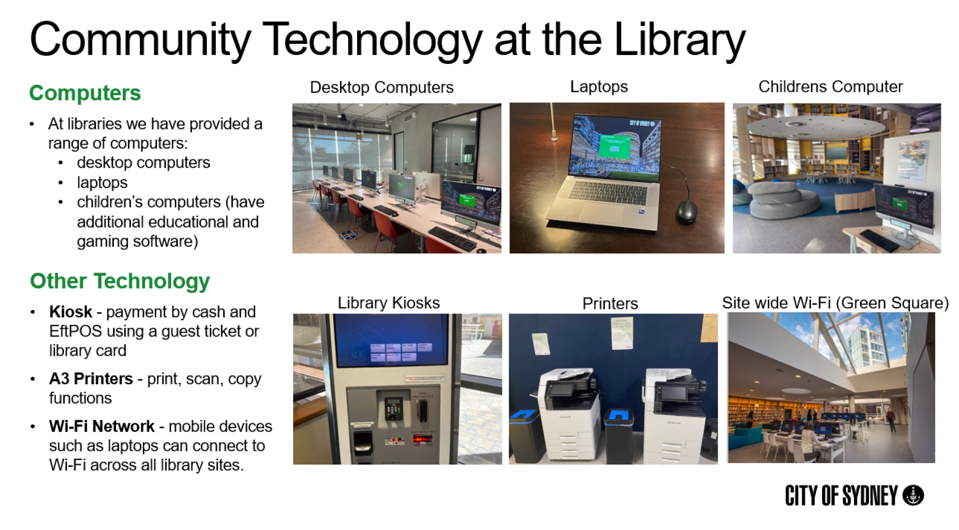 Key improvements included the rollout of new high-performance computers, high-speed internet and Wi-Fi coverage across sites, inclusive software and accessibility tools, and proactive system monitoring to ensure service reliability. The initiative also supported new digital literacy programs tailored to different age and skill groups, fostering confidence and capability across the community. This holistic, community-centred approach not only provides immediate access to technology but builds long-term digital capability, social connection, and economic opportunity - helping to close the digital divide and foster a more inclusive and resilient city.