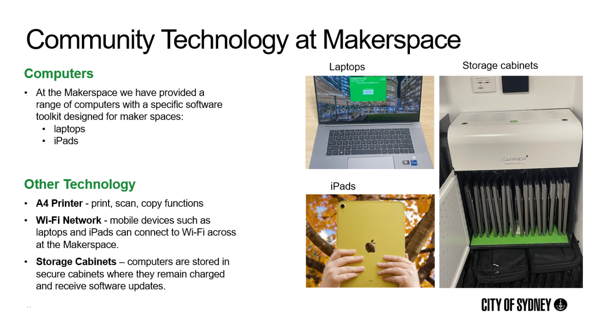 In response, the City embarked on a strategic and community-centred transformation across its libraries, community centres, child care spaces, makerspace and venues for hire. Extensive engagement was conducted with residents, frontline staff, and internal council teams to understand specific barriers, needs, and expectations. This collaborative research informed the development of a new, comprehensive Community Technology Initiative - designed to modernise infrastructure, reduce barriers to participation, and improve digitally equity and inclusion for individuals in our community.